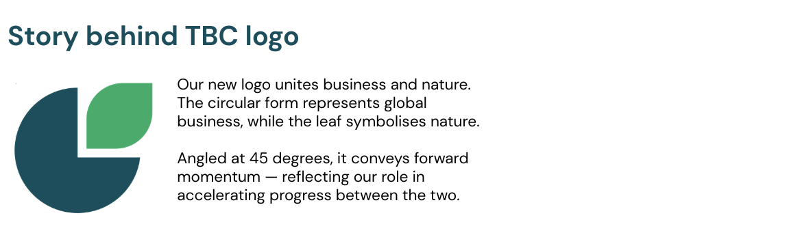 The refreshed logo has been designed as a visual expression of this understanding and TBC’s role in it. It symbolises the global biodiversity challenge, the interface between business and nature, and TBC’s role in helping organisations keep pace with this changing landscape by harnessing the outcomes from our scientific expertise to deliver credible, practical action for clients.